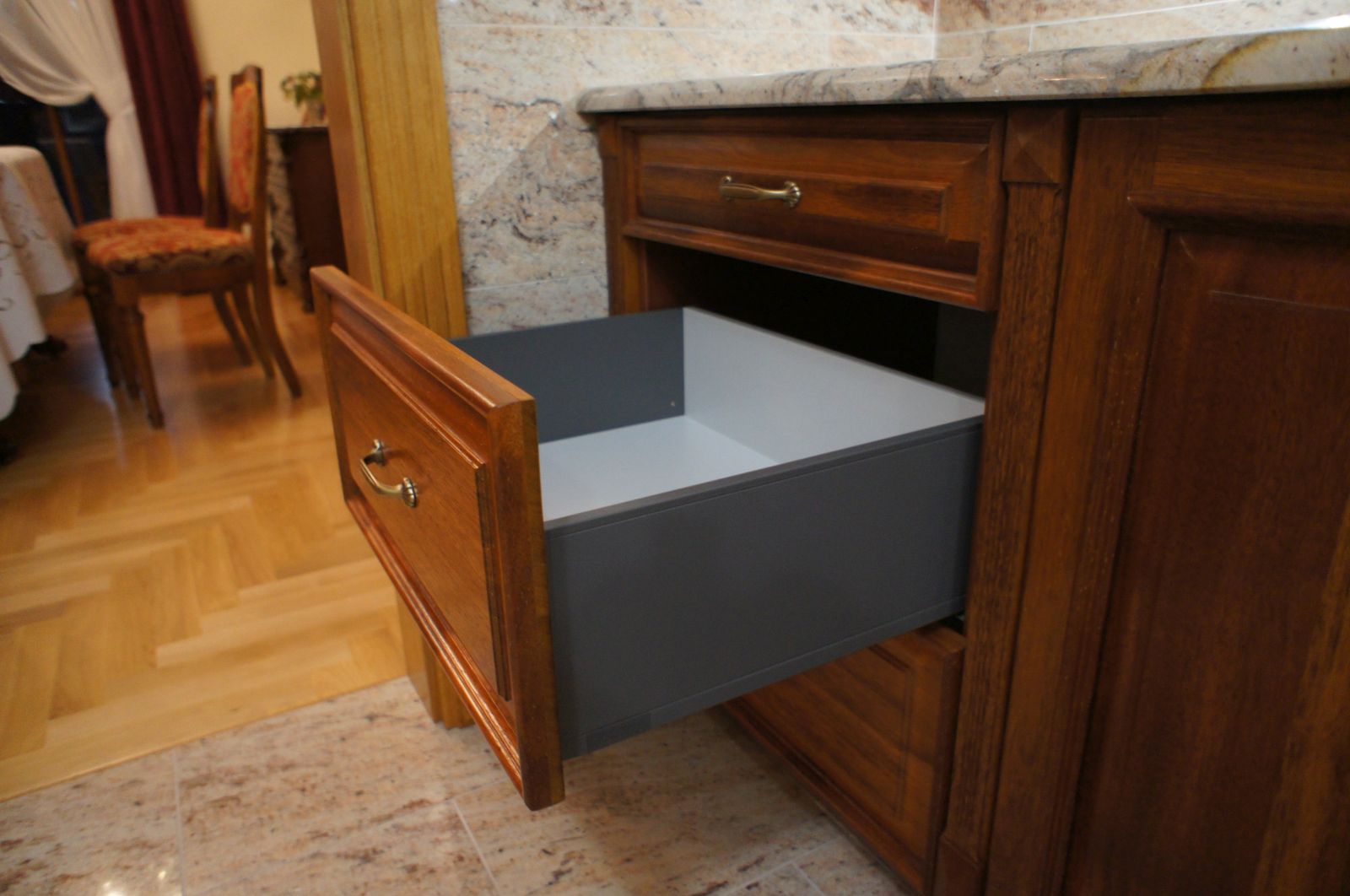 fronty, cokoły, pilastry z litego drewna egzotycznego merbau.