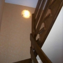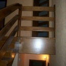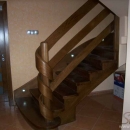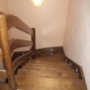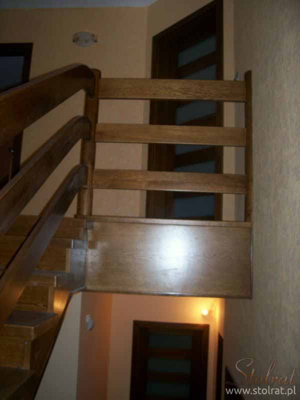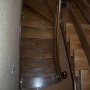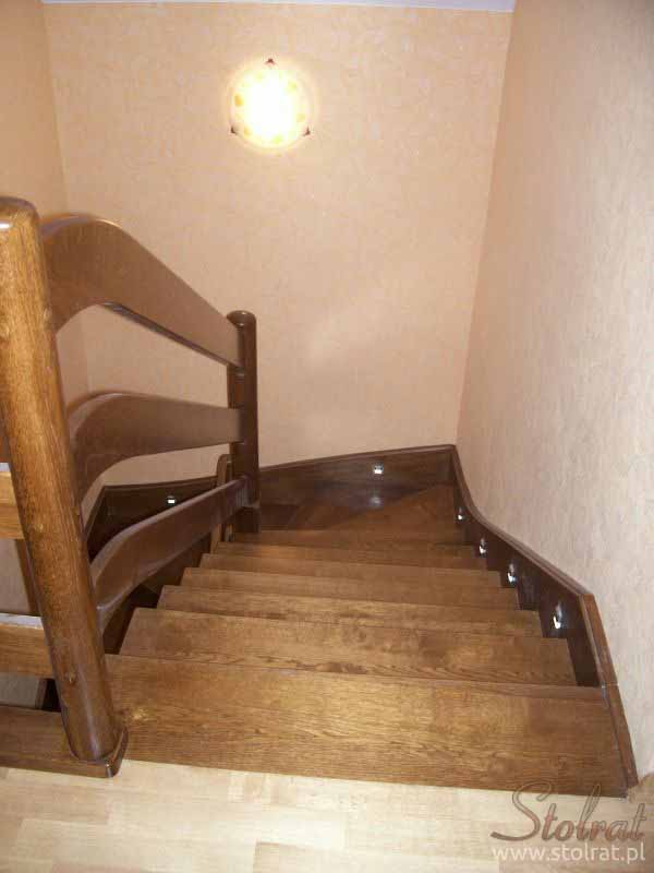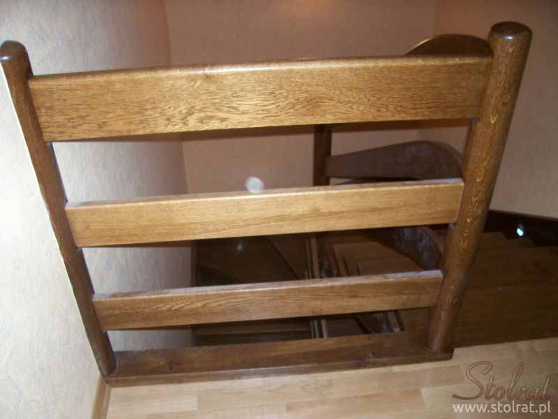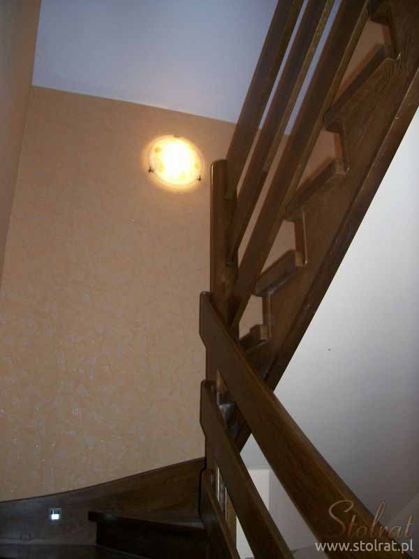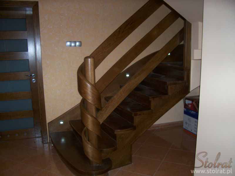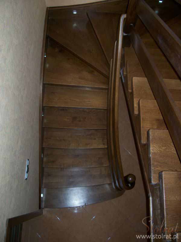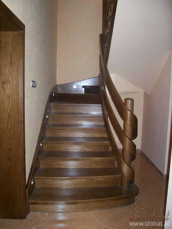 Schody obkładowe na beton. Materiał dąb barwiony. Balustrada pochwyt drewniany zakończony spiralnie.
