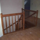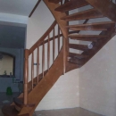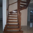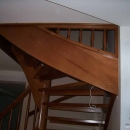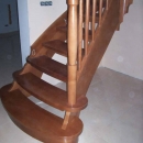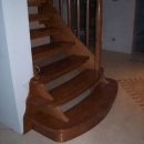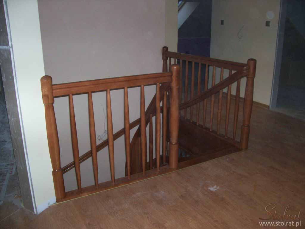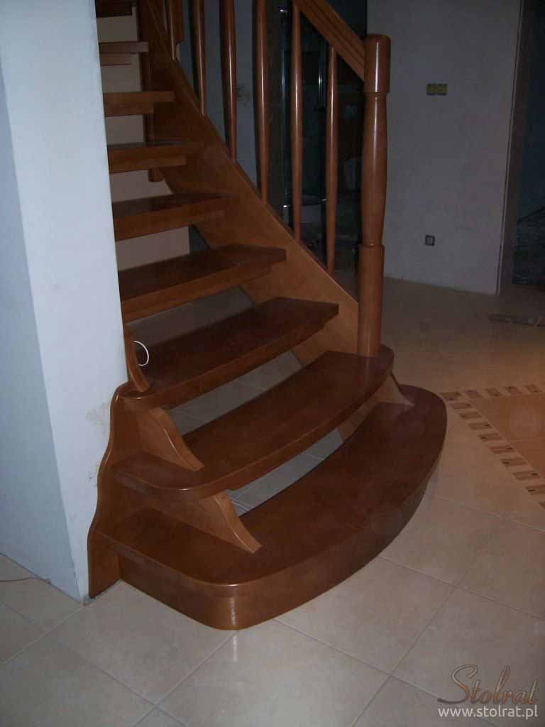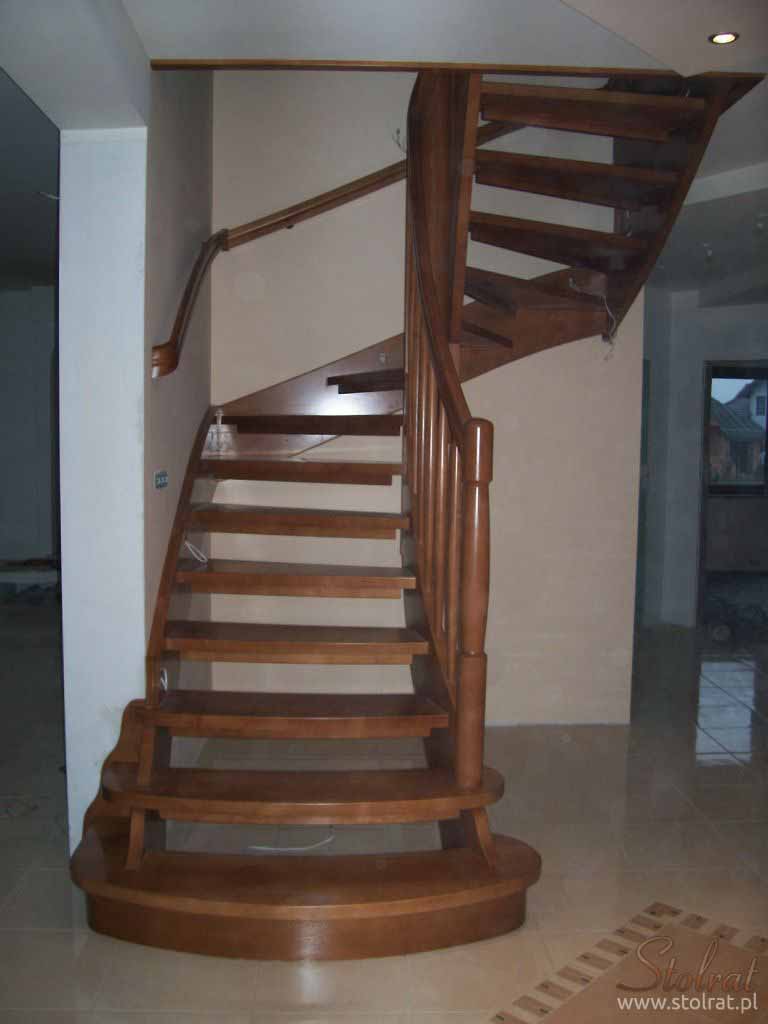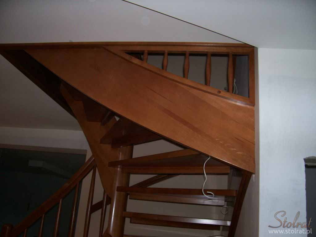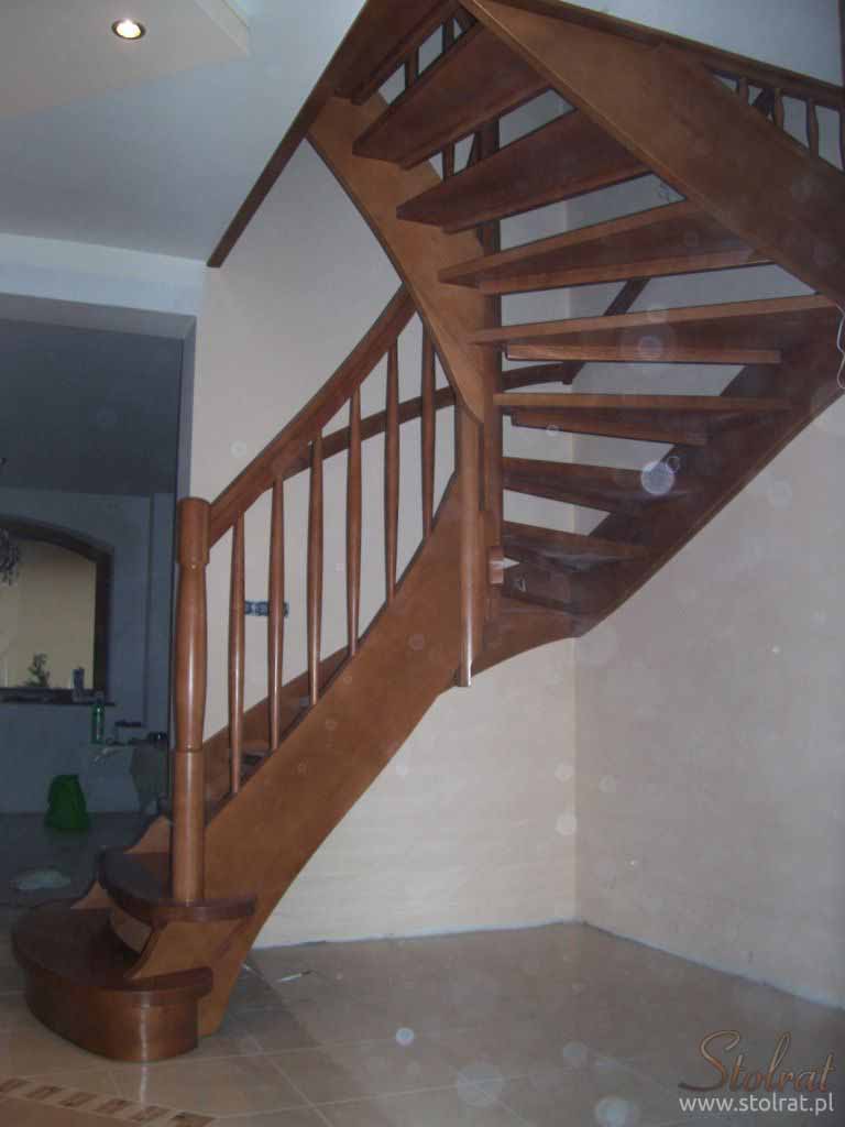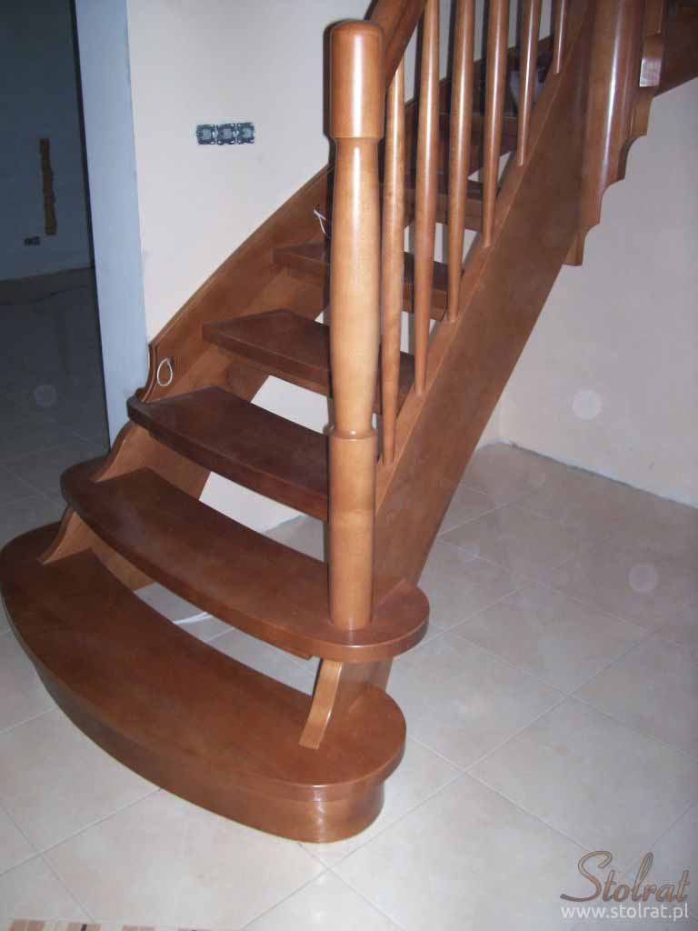 Schody zabiegowe, ażurowe. Materiał buk barwiony. Balustrada pochwyt drewniany oraz toczone tralki.