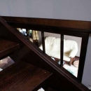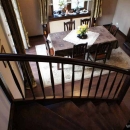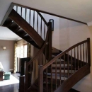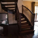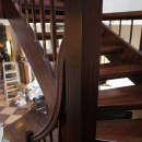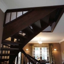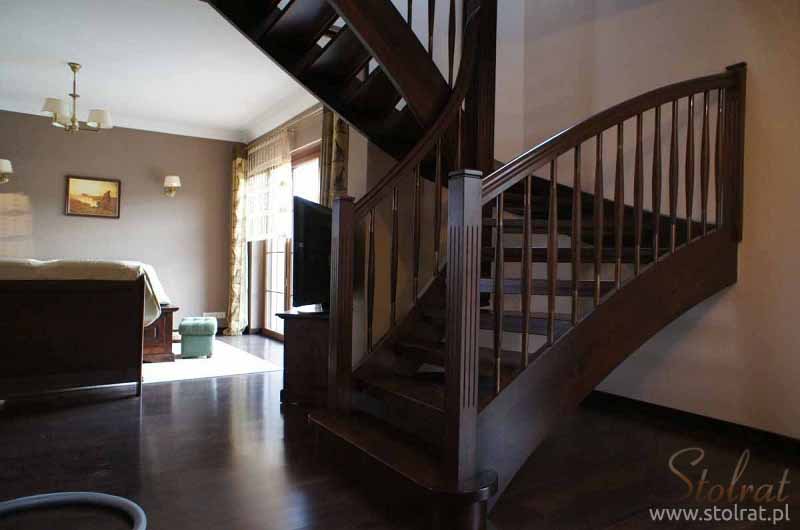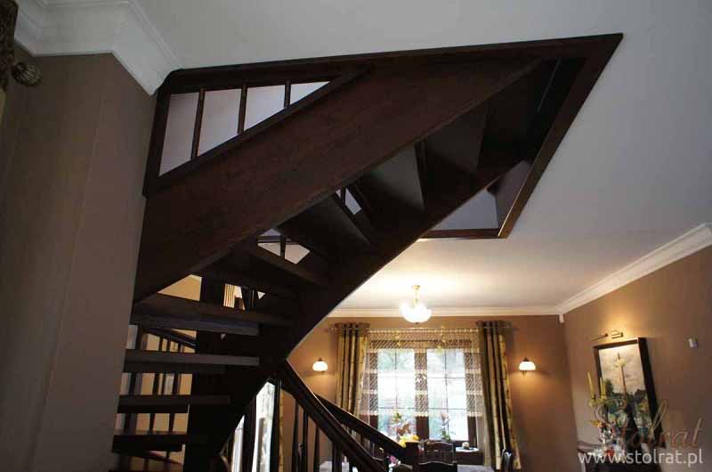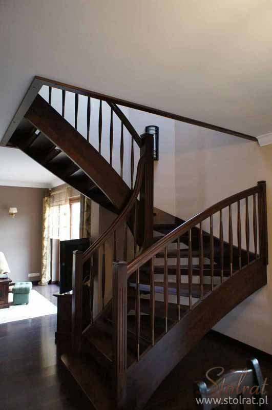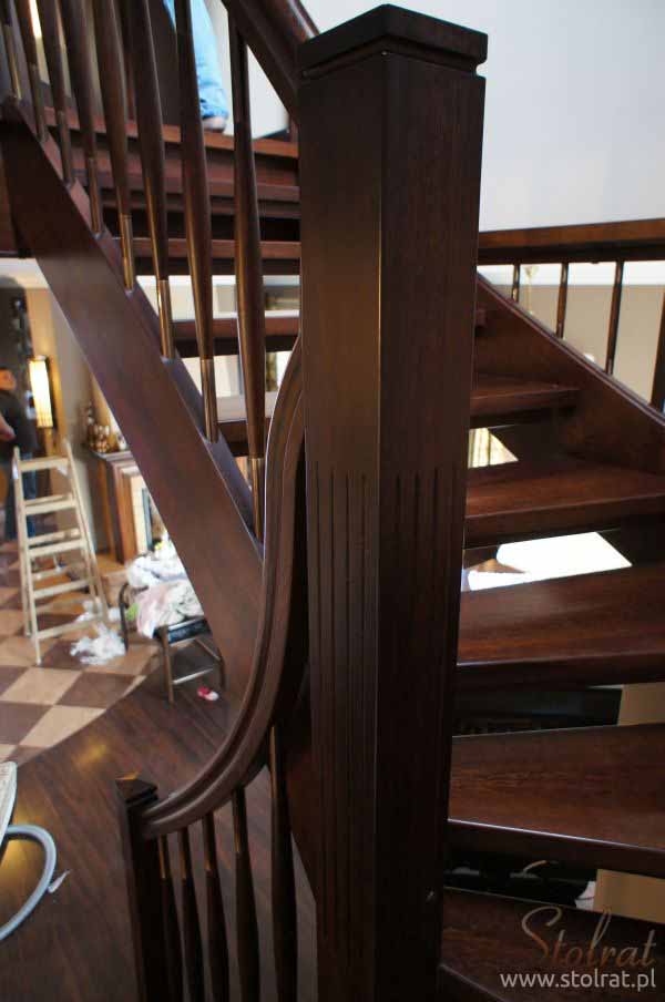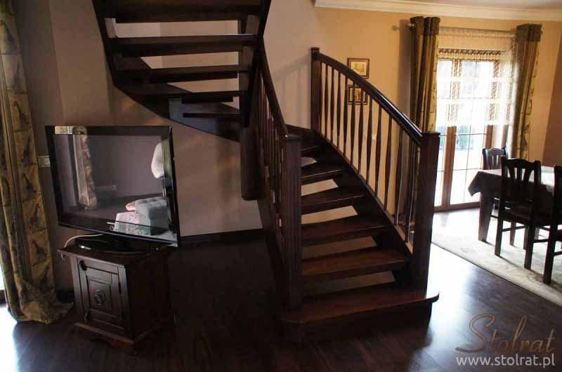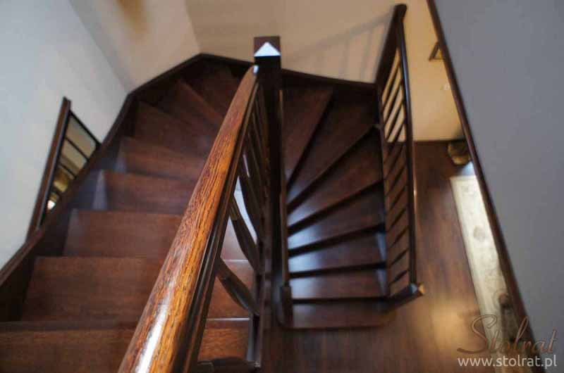 Schody zabiegowe, ażurowe, materiał dab barwiony, balustrada pochwyt drewniany oraz toczone tralki.