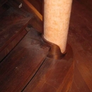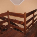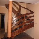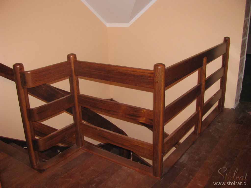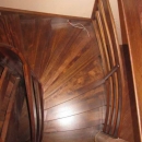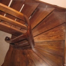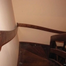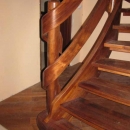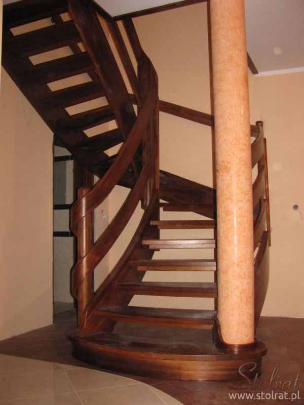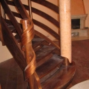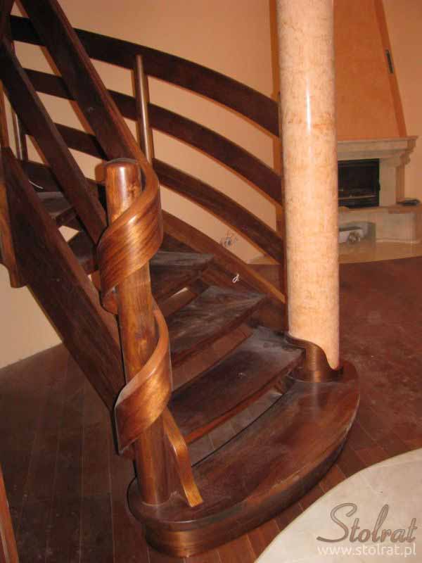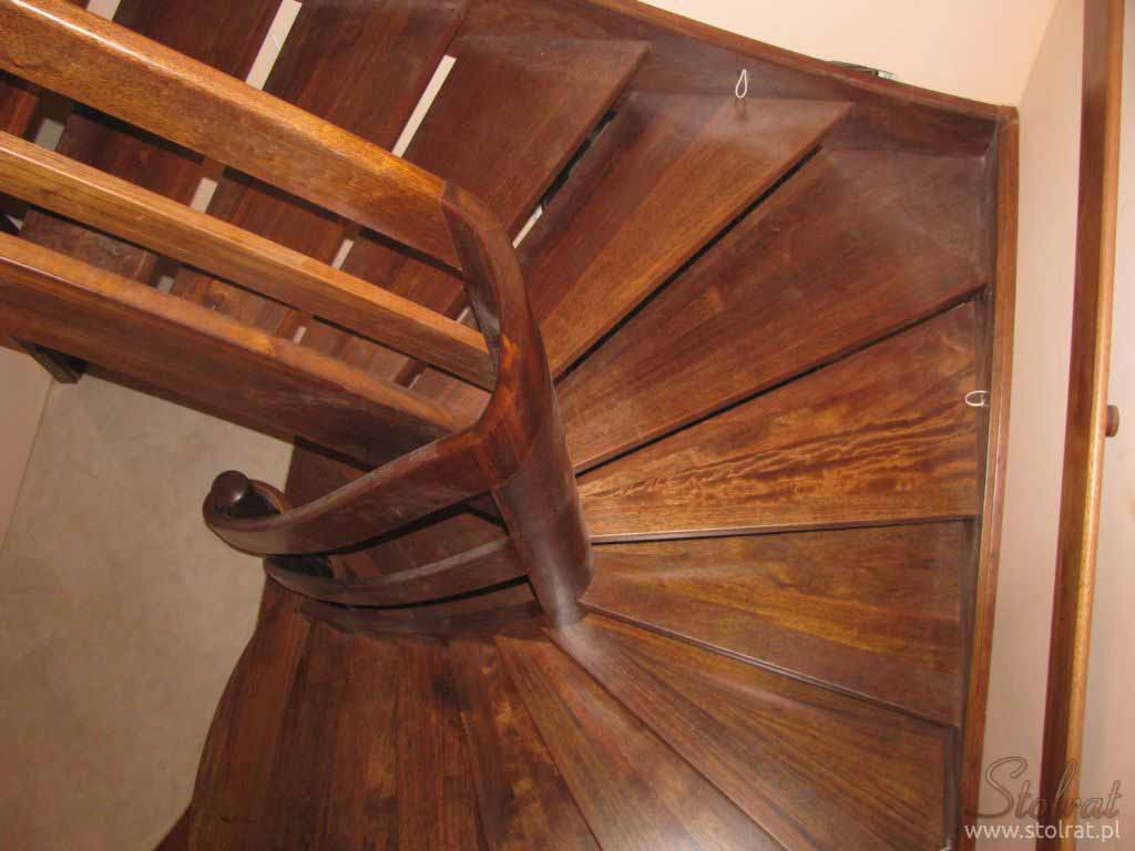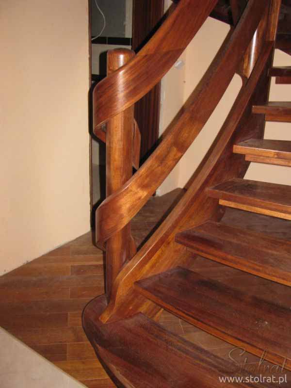 Schody zabiegowe, ażurowe, materiał drewno egzotyczne merbau, balustrada pochwyt drewniany zakończony spiralą.