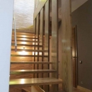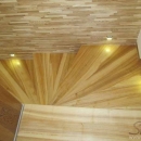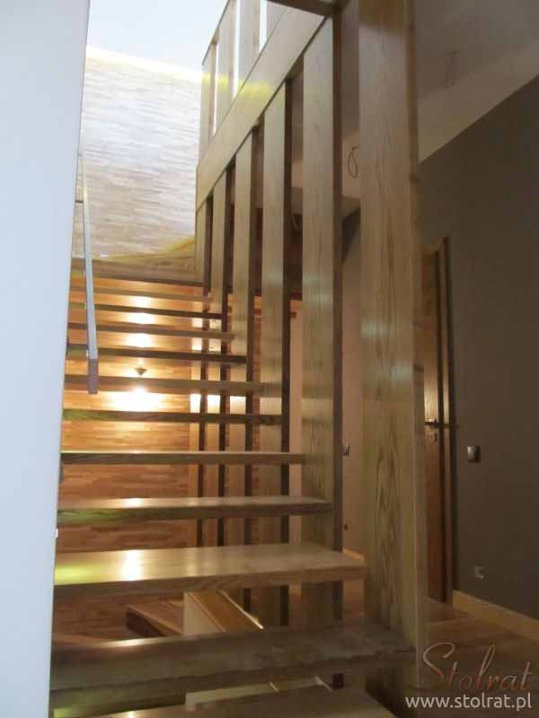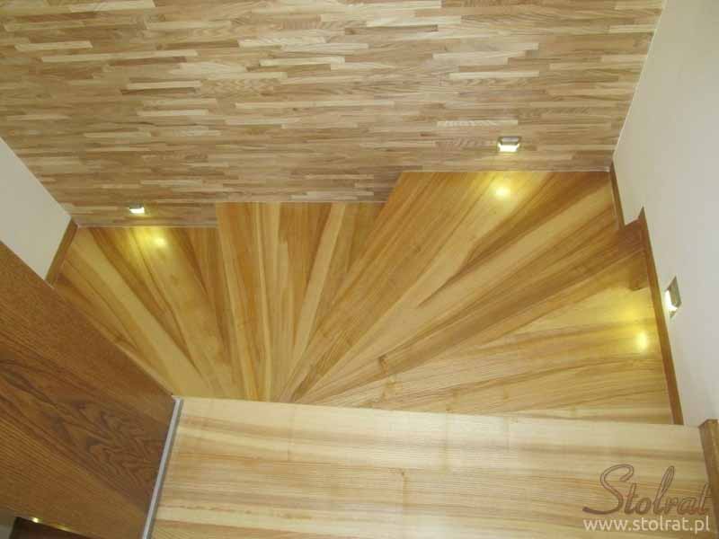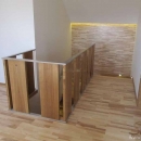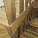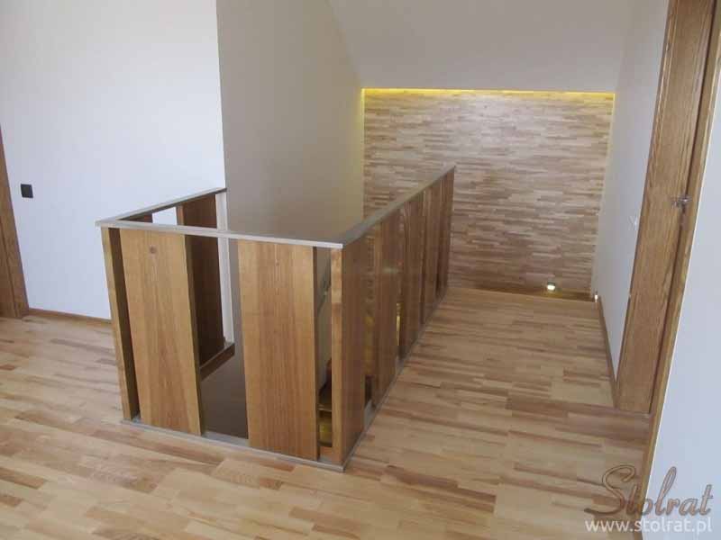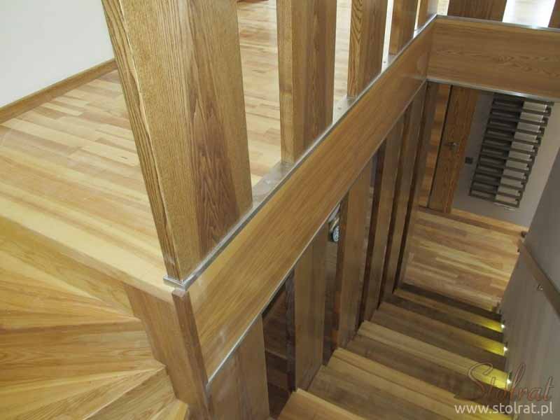 Schody panelowo-dywanowe, materiał jesion olejowany. Balustrady - pochwyt stal nierdzewna