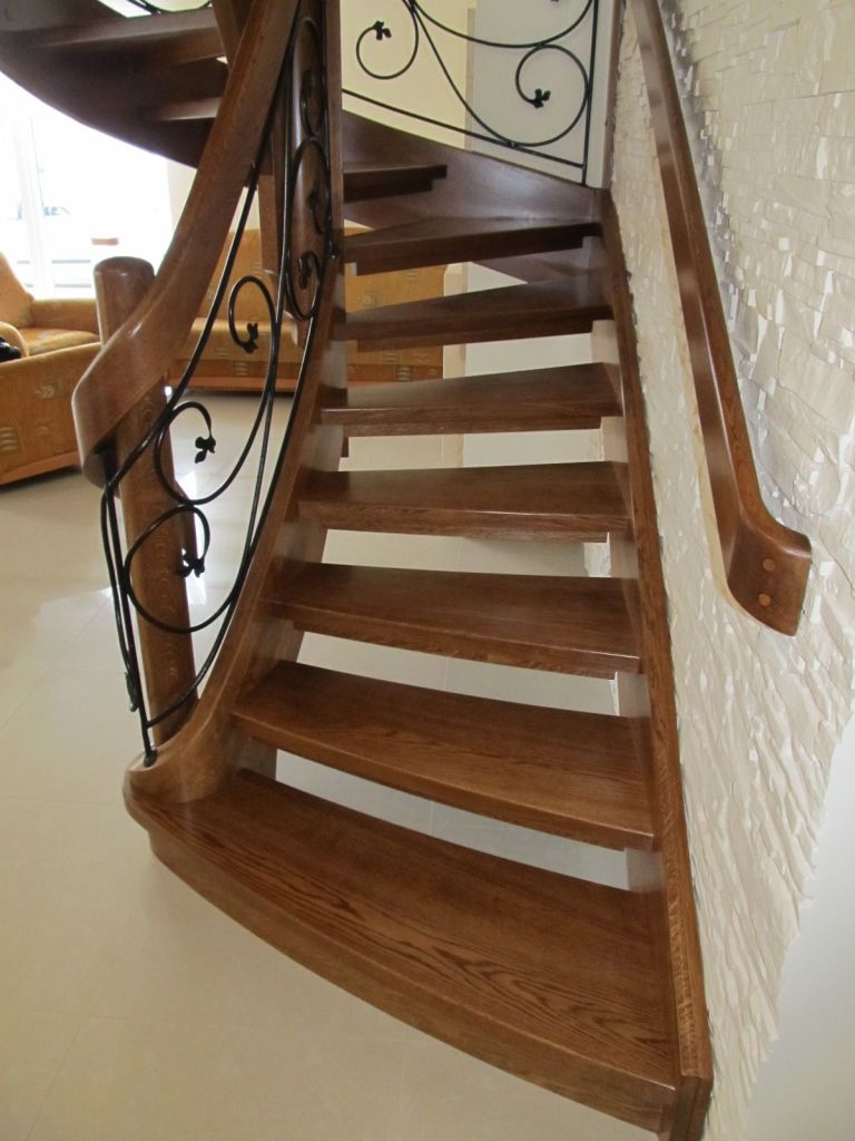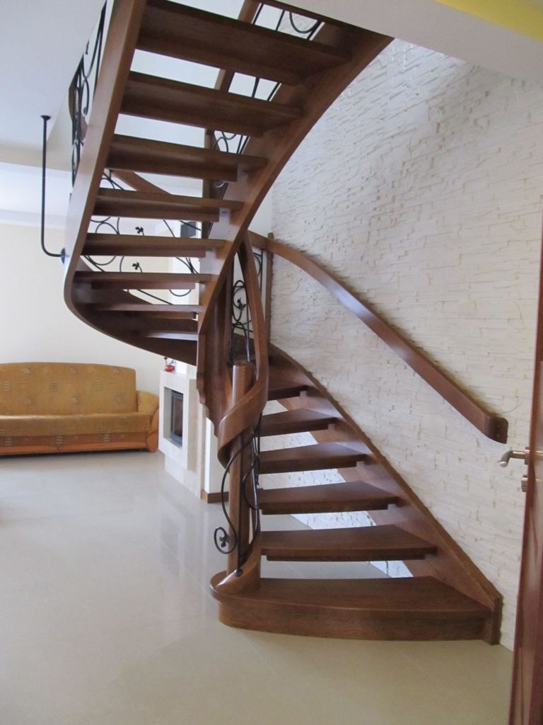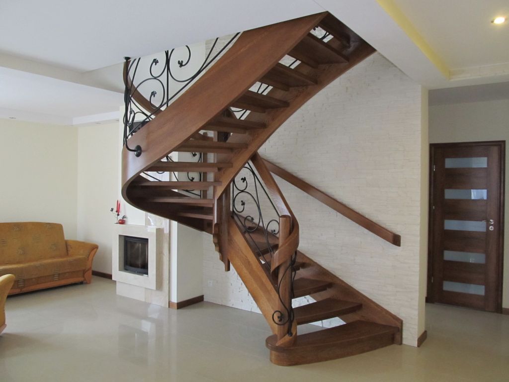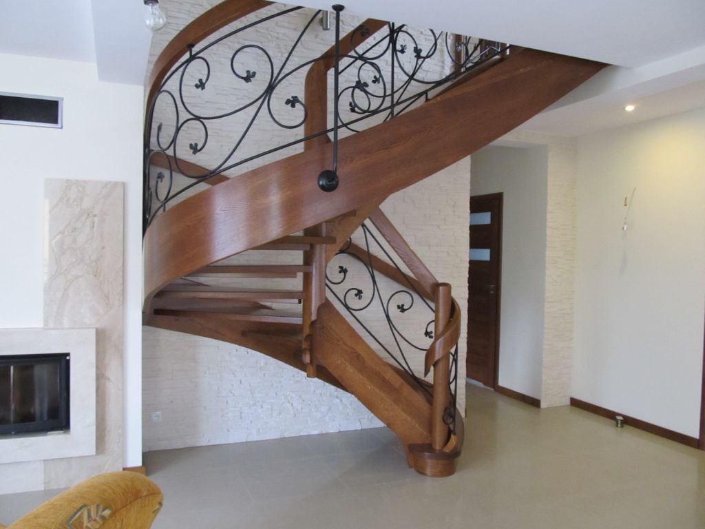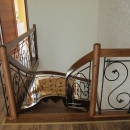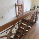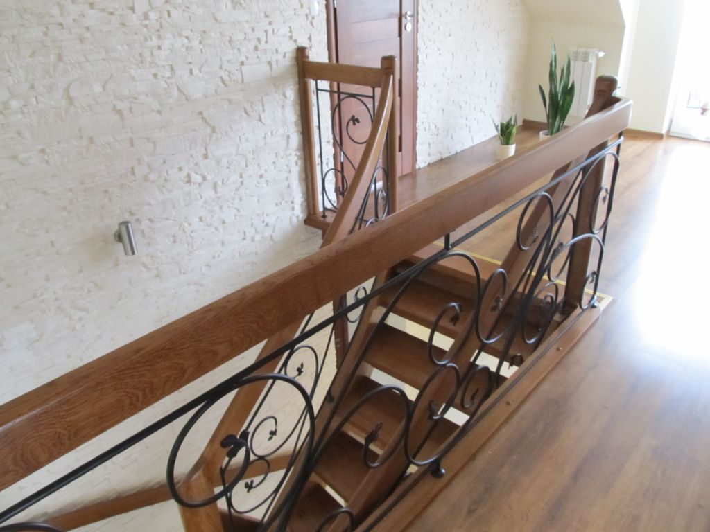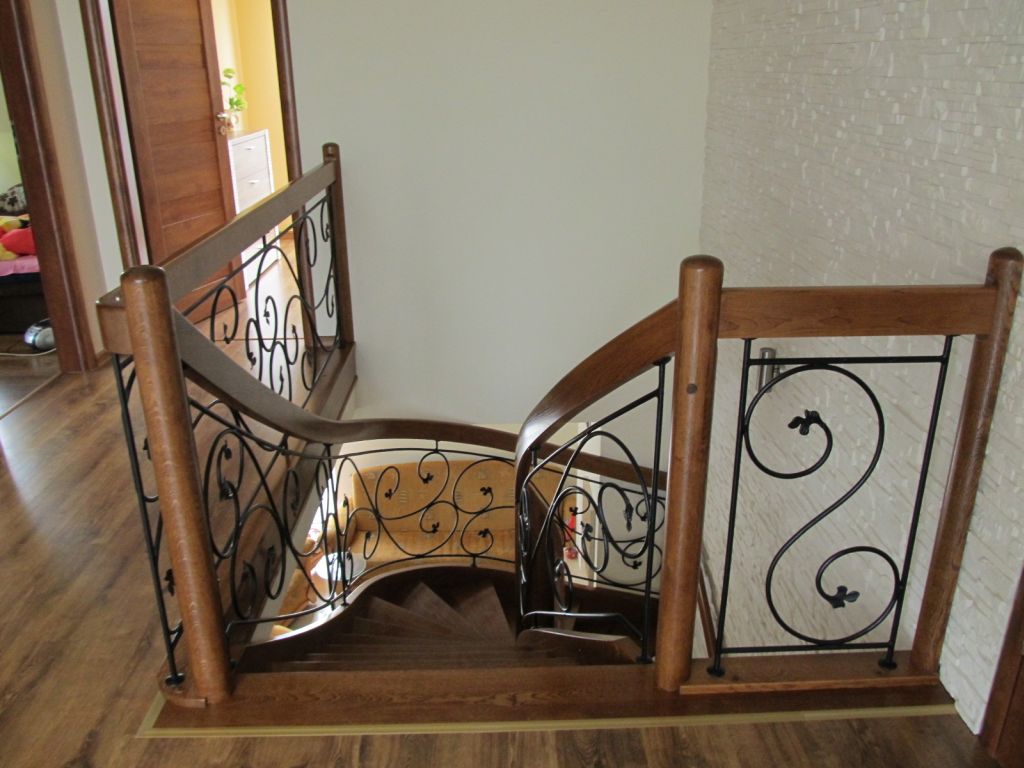 Balustrada pochwyt drewniany zakończony spiralnie oraz metaloplastyka.